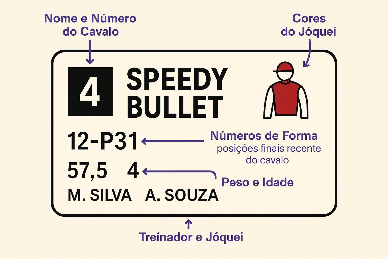 - Nome e Número do Cavalo: O nome do cavalo geralmente aparece em destaque, bem como o seu número.