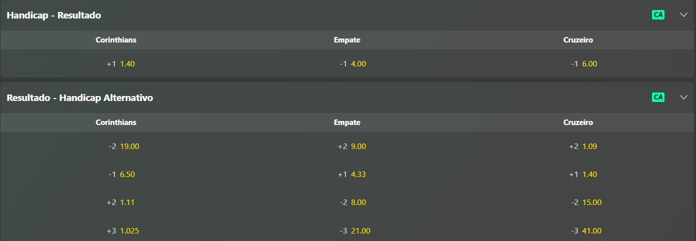 O handicap é uma forma de nivelar o jogo entre duas equipes com habilidades diferentes. Funciona como uma vantagem virtual para o azarão (+) ou uma desvantagem virtual para o favorito (-).